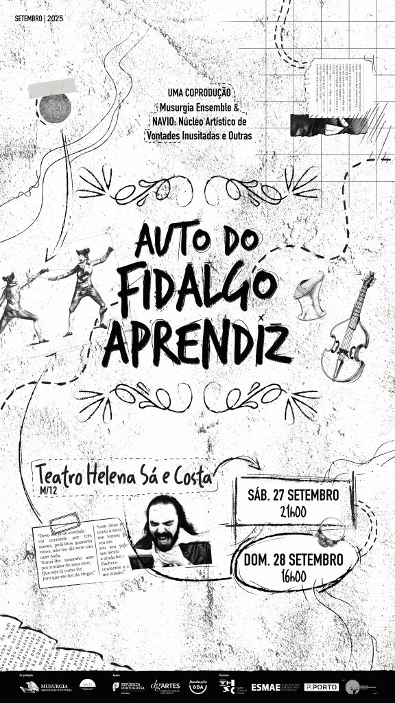 A Musurgia – Associação Cultural, em conjunto com o NAVIO: Núcleo Artístico de Vontades Inusitadas e Outras, apresentam uma coprodução do Auto do Fidalgo Aprendiz onde dialogam a dramaturgia contemporânea e a estética do teatro e da música ibérica barroca. Numa constante e atarantada troca de personagens e de estilos de representação, um conjunto de engenhosos saltimbancos, a mando de Alfonso, edificam um embuste contra Dom Gil Cogominho, o fidalgo, que inocentemente tropeça entre xácaras, chacones e pavanas.