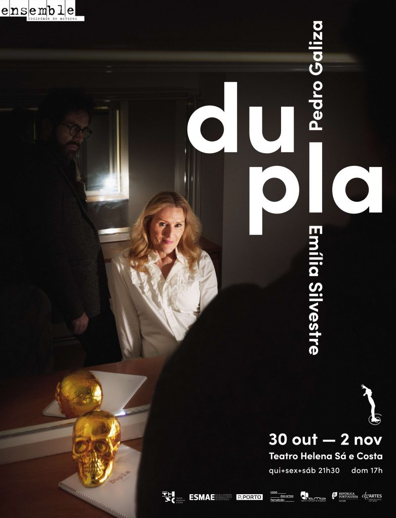 Cinquenta anos de carreira. Uma efeméride a celebrar, obviamente, mas também uma punição: o teatro, em penosa e permanente busca de uma verdade alicerçada em fingimentos, é um bicho difícil de domar, pois morde tanto quanto ronrona. E uma actriz que há cinco décadas viva exclusivamente de e para o teatro há-de ter-se convertido, ela própria, numa fera muito especial, eminentemente observável, sim, belíssima na sua fúria e graciosamente perigosa na sua madura subtileza, mas tão, tão frágil no seu medo. Tresandam a morte, esses longuíssimos cinquenta anos. E ela sabe-o. Partindo de Ma Double Vie, a auto-biografia que Sarah Bernhardt escreveu quando a celebrada actriz tinha a idade exacta da nossa ficcionada protagonista, DUPLA é um choque frontal entre duas aparentemente irreconciliáveis personalidades: a da actriz experiente, que sabe muito bem o que é o teatro, e a do dramaturgo/encenador/criador/vendedor da banha da cobra, que de teatro sabe muito pouco. Mas o palco é, também, uma fecunda incubadora destas situações comicamente impossíveis, pois à vida, além das duas normalmente mencionadas – a morte e os impostos – uma terceira fatalidade há que ser acrescentada: a data de estreia. Isto vai ter de estrear, dê lá por onde der. E esta dupla que se amanhe.