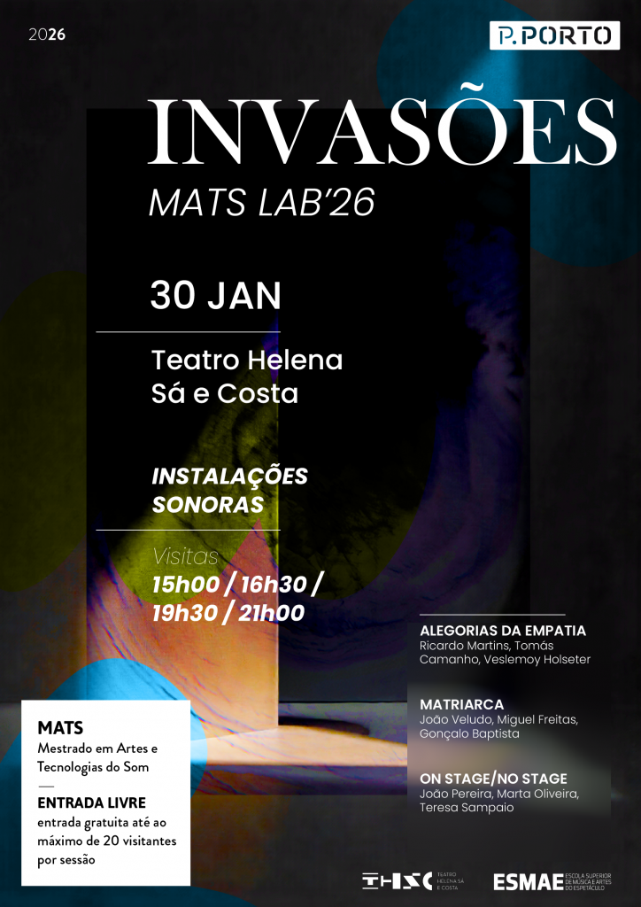 No dia 30 de janeiro de 2026 (sexta-feira), o Teatro Helena Sá e Costa (THSC) acolhe o MATS Lab 2026 – INVASÃO, uma mostra dedicada a instalações sonoras criadas por estudantes do Mestrado em Artes e Tecnologias do Som (MATS) da ESMAE, no âmbito da UC de Laboratório de Criação. O evento terá 4 sessões abertas ao público: 15h00, 16h30, 19h30 e 21h00. As obras apresentadas invadem os espaços do THSC desafiando o público a relacionar-se com as experiências sonoras propostas. Cada instalação resulta de um processo criativo colaborativo que alia arte, som e tecnologia, refletindo a essência experimental e interdisciplinar do MATS.
